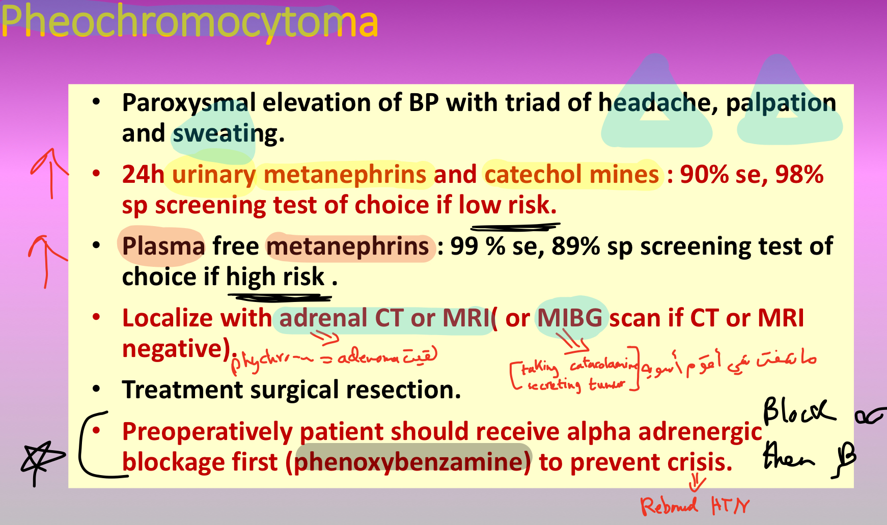 elevated plasma metenephrine levels = phyochromocytoma it's always treated by SURGERY. check the signs and symptoms of phyochromocytoma as well.