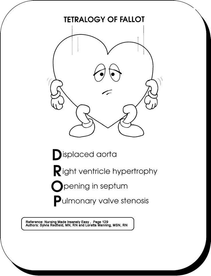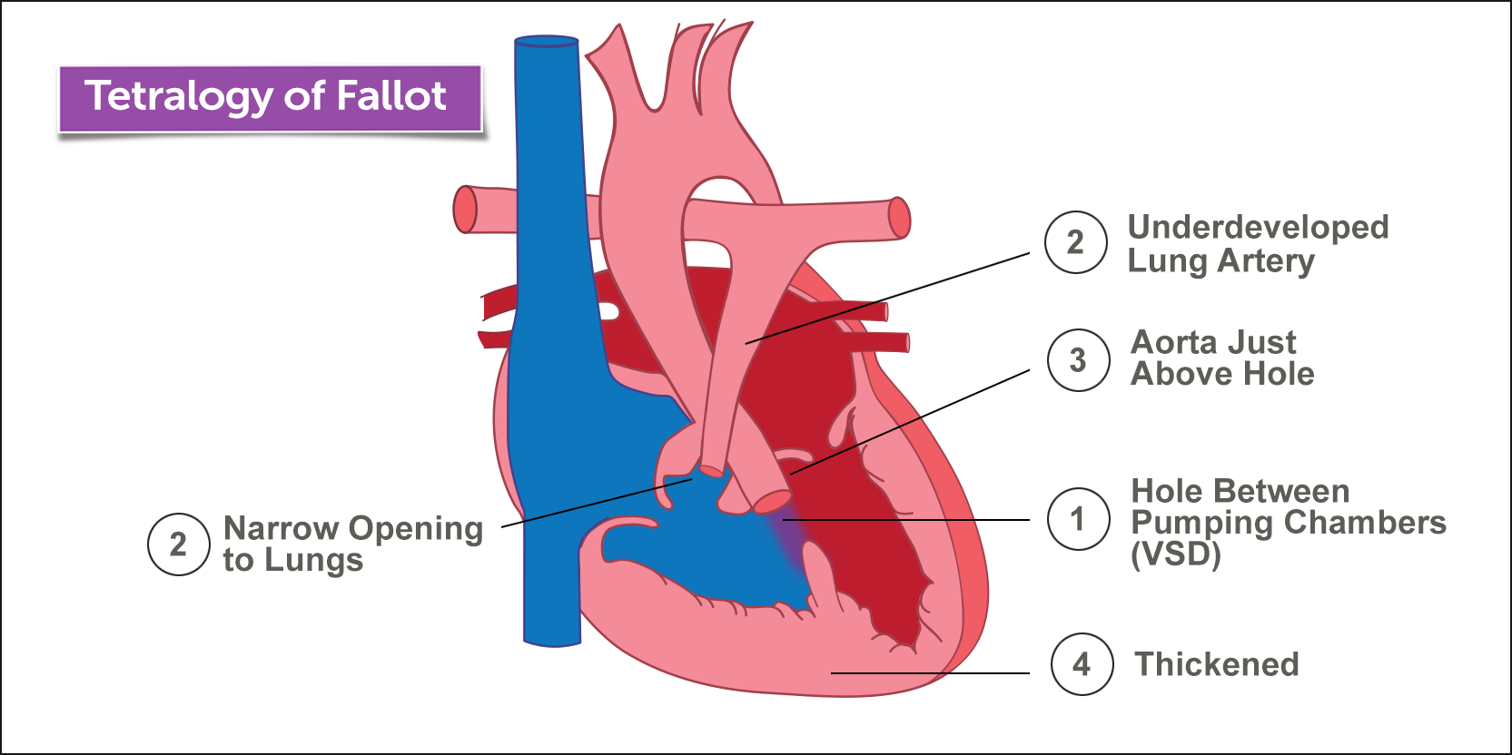 Picture below: 1) pulmonary stenosis 2) overriding of the aorta 3) ventricular septal defect 4) right ventricle hypertrophy